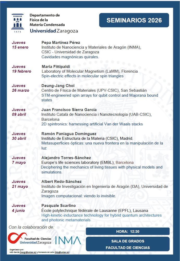 Este evento está dentro del Programa de Seminarios (INMA Impulso), que junto con el Ciclo de Seminarios del Departamento de Física de la Materia Condensada forman parte de la Propuesta de Actividades Universitarias Culturales y Complementarias de carácter específico del Departamento de Física de la Materia Condensada de la Universidad de Zaragoza.